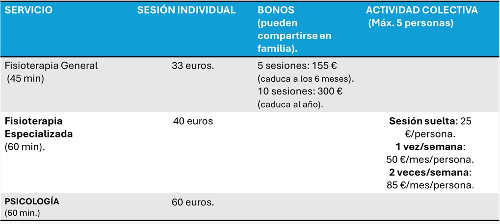 Asimismo, se recogen las tarifas del nuevo servicio de Psicología, a cargo de nuestra Psicóloga General Sanitaria.